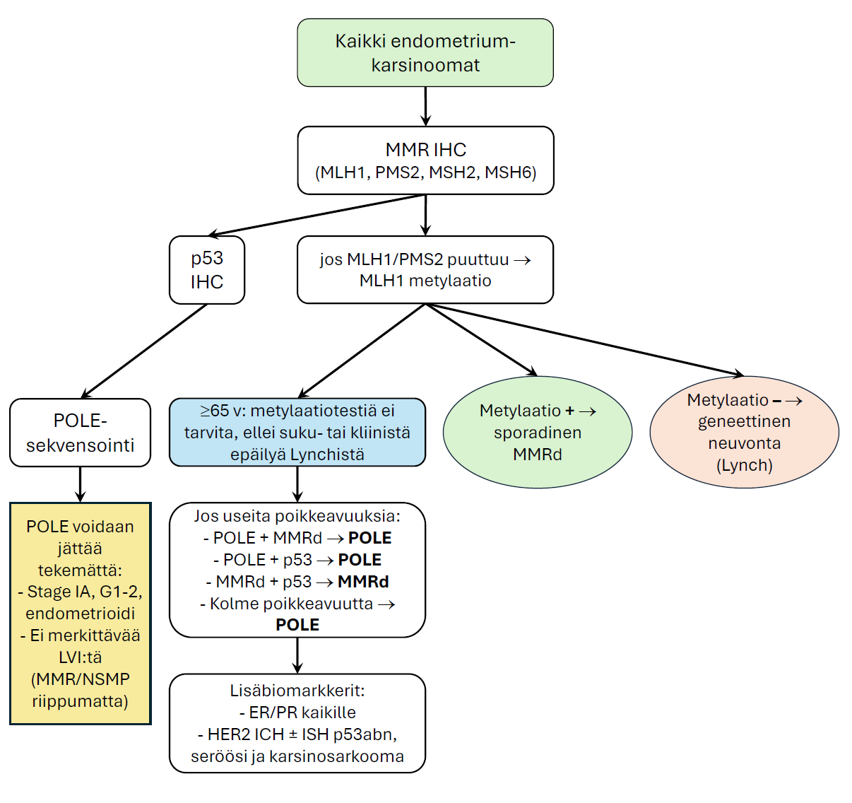 | POLEmut stage I-II, joka kuuluu ilman molekulaarista luokittelua vähintään korkean keskitason riskiin | Ensimmäinen käynti 6 kk, sitten vuosittain ad 3 v. ja oire-pkl ad 5 v. | ||
